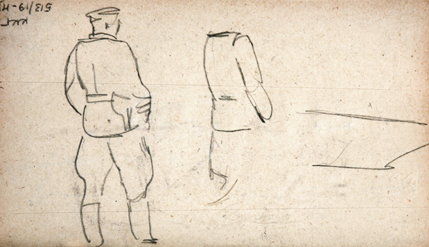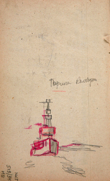 Блокнот с набросками, сделанными в севастопольскую поездку художника 1934 года, полон зарисовок на одном дыхании, почти одной линией, мгновенно и просто. Карандаш без отрыва схватывает позу, фигуру, строения, детали одежды, силуэт корабля… Зарисовки порой снабжены поясняющими надписями – «залив», «море», «свет», «на переднем плане теленок»… Это абсолютно прагматичная «кухня», где художник нащупывал будущее решение. Где-то – это композиционный строй, где-то – информативные детали, характер, гротеск, линия, подсказанная натурой.