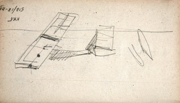 Сидящего моряка, зарисовку набережной, кораблей, групп людей можно отыскать позднее в живописном полотне «Севастополь. У мола» 1934 /ГТГ/ (Воспр.: А.А. Дейнека. Живопись. Графика Скульптура. Мозаика. Л.: Аврора, 1982, ил. 88); рисунок подводной лодки – в картине «Балаклава»1934 /ГТГ/ (Воспр.: В.П. Сысоев. Александр Дейнека. Монография. М.: Изобр. искусство. 1989, ил. 87). В блокноте – это несколько линий, штрихов, иногда части композиции, набросанные на нескольких листах. Порой в хаотичных, понятных только художнику движениях карандаша угадываются записи о цвете: «умбра», «фиолет.». К этому времени Дейнека очень любил и сами полеты, и всю авиационную тематику. На страницах блокнота запечатлены и такие моменты. Уже совсем путанные, малопонятные зарисовки в самолете перемежаются записями: «горизонт», «облака», «горы», «виражи», «почему толчки», «порыв ветра».